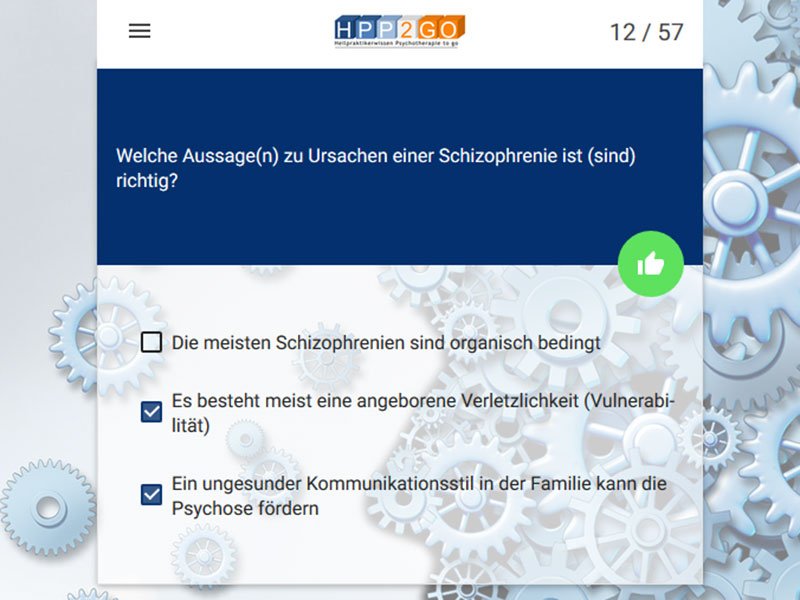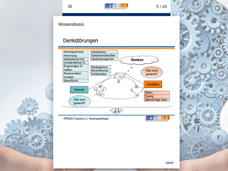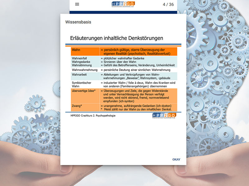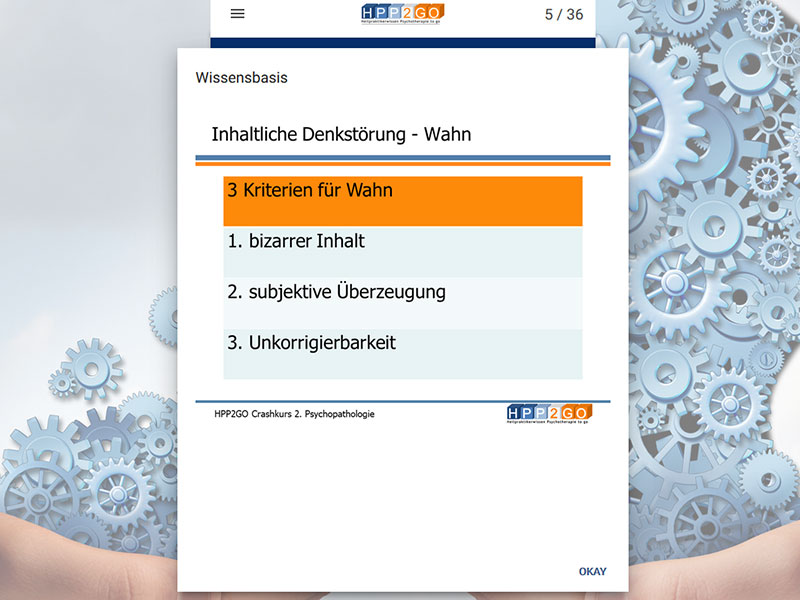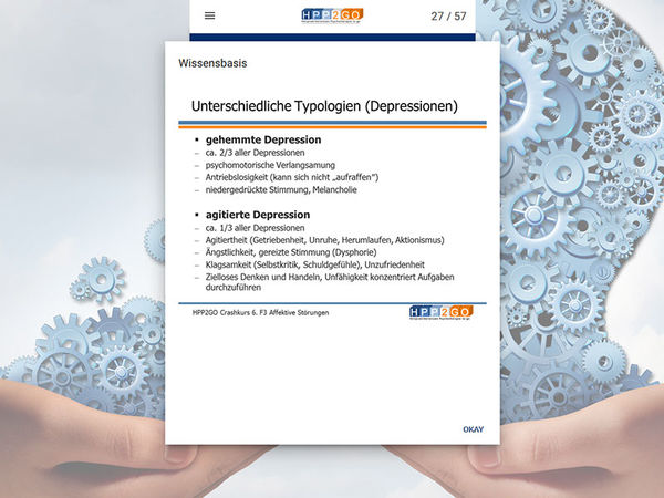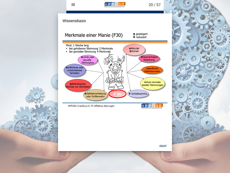Die Inhalte der Crashkurs Module folgen wie das HPP2GO Audio und der HPP2GO Prüfungsfragentrainer der Struktur des ICD-10 Kapitel V(F).