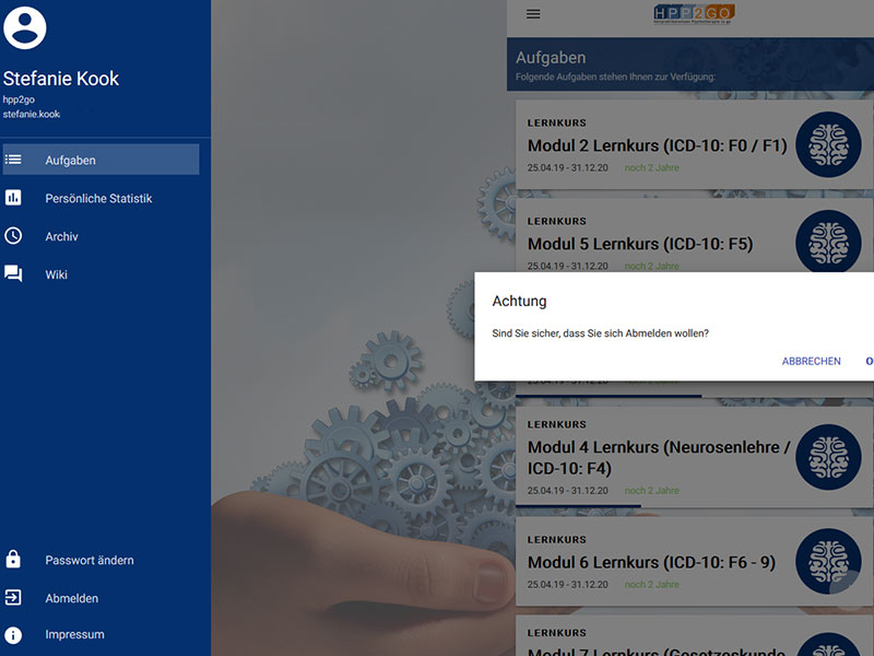 Zu jeder "Folie" erfolgt direkt im Anschluss eine Wissensüberprüfung. Ein Modul beinhaltet bis zu 60 Wissenseinheiten und Fragen.